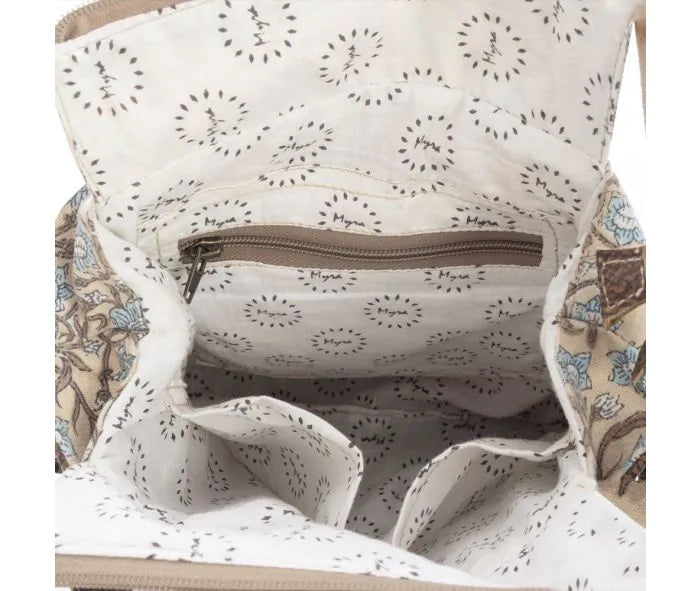 San Ysidro Falls shoulder bag. Hues of blue, mocha, ivory and chocolate. Pattern leather with zipper close top. Front and back zipper pouch. Detachable/adjustable shoulder strap.