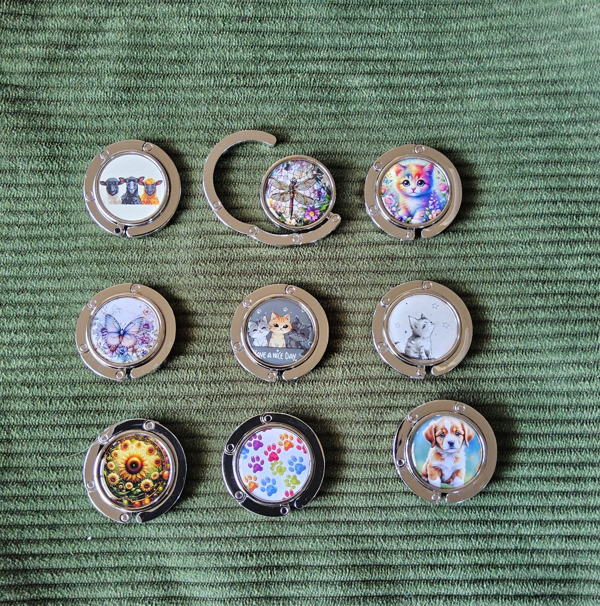 Various designs of purse hooks. Carry with you in your bag so you will always be able to hang it on the table instead of the floor or back of seat.
